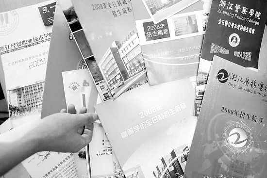她舉例說,她手上有一份浙江經(jīng)貿(mào)職業(yè)技術(shù)學(xué)院全日制高教自考的招生簡章,封面和簡章內(nèi)主要篇幅都在介紹浙江經(jīng)貿(mào)職業(yè)技術(shù)學(xué)院的優(yōu)勢(shì)和下沙新校區(qū)!翱缮厦娴膱(bào)名地點(diǎn)在文一路,而上課的地方卻在三墩!