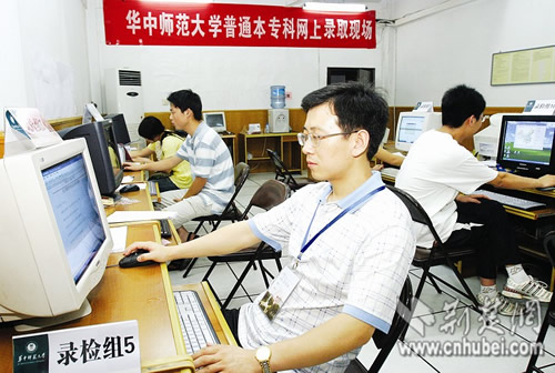 今年在全國(guó)高校中,華中師范大學(xué)是唯一一所所有專業(yè)均在湖北提前批次錄取的高校。昨晚9時(shí),記者在華中師范大學(xué)2008年高招錄取現(xiàn)場(chǎng)看到,該校數(shù)臺(tái)高招錄取專用電腦已全部就位,多名招生人員正緊張地守在錄取電腦前,進(jìn)行接收投檔前的各項(xiàng)準(zhǔn)備工作。
