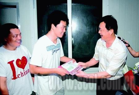 “祝賀你!通過自己的努力即將成為一位民航飛行員,愿你越飛越高!”昨日上午10點,當(dāng)身高近1.8米、家住都江堰胥家鎮(zhèn)大林村五組的易爽,用顫抖的雙手從中國民航飛行學(xué)院黨委書記朱勇手中接過裝有自己錄取通知書的信封時,現(xiàn)場閃光燈立刻閃成一片。與通知書同時遞到易爽手中的還有一束鮮艷的百合花和1000元愛心助學(xué)金。這也是我省08年高考提前批錄取工作正式開始后,由省招辦發(fā)出的第一份高考錄取通知書,而易爽則是我省高考普通類招生第一位拿到大學(xué)錄取通知書的考生。