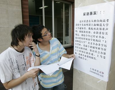 圖片說明:師大錄取通知書發(fā)現(xiàn)造假,兩名學(xué)生正在了解告示相關(guān)內(nèi)容。