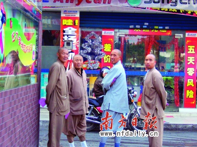 昨日上午10點(diǎn)30分,記者在丹灶街頭采訪(fǎng)時(shí),巧遇一群“和尚”打扮的人,他們?cè)诘ぴ畛菂^(qū)商業(yè)大街的一些店鋪或商場(chǎng)間穿梭,時(shí)而分頭行動(dòng),時(shí)而又聚在一起,行色匆忙。
