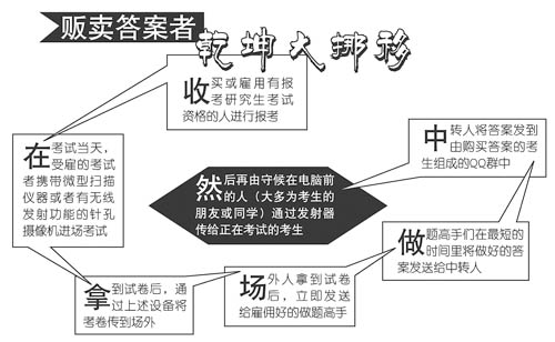 首先,雇用有報(bào)考研究生考試資格的人進(jìn)行報(bào)考,在考試當(dāng)天,受雇者攜帶微型掃描儀器或有無線發(fā)射功能的針孔攝像機(jī)進(jìn)入考場考試,拿到試卷后,通過上述設(shè)備將考卷傳到場外,場外人拿到試卷后,立即發(fā)送給雇用好的做題高手,做題高手在最短的時(shí)間里將做好的答案發(fā)送給中轉(zhuǎn)人,中轉(zhuǎn)人再將答案發(fā)到由購買答案的考生組成的QQ群中,然后再由守候在電腦前的人(大多為考生的朋友或同學(xué))通過發(fā)射器傳給正在考試的考生。