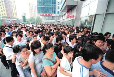 昨天上午9點(diǎn)30分,朝陽(yáng)人才市場(chǎng)的門前就排起了長(zhǎng)隊(duì)。該市場(chǎng)舉辦的多為專場(chǎng)招聘會(huì),平時(shí)求職者最多也就2000人左右,像昨天一下子來(lái)了5000多人顯然超出了市場(chǎng)的承載能力。為了保障安全,主辦方不得不采取臨時(shí)控制人流的措施,每隔10分鐘放行30人入場(chǎng)。當(dāng)天,用人單位提供的崗位只有500余個(gè),供求比高達(dá)10∶1,職位競(jìng)爭(zhēng)非常激烈。由于人多,原本在下午1點(diǎn)鐘結(jié)束的首場(chǎng)招聘會(huì)被延至5點(diǎn)。