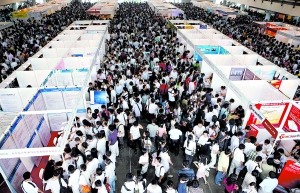據(jù)介紹,此次共吸引了600多家用人單位參展,提供了5000余個職位,主要涉及工程技術(shù)、電子、銷售、人力資源以及制造業(yè)等。其中,不乏中國人壽、百盛、北大青鳥、聯(lián)想、百度、大中等知名企業(yè)。在舉行招聘會的國展2、3、4號館里,應(yīng)聘者人頭攢動,水泄不通,主辦方為了保證三個展館內(nèi)的正常運行還進(jìn)行了暫時的人流控制和疏導(dǎo)。截至昨天11時,招聘會已吸引了近2萬名求職者。