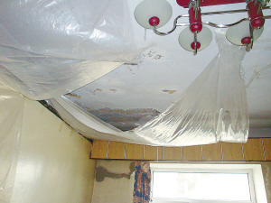 昨天,記者在道里區(qū)安道街34號(hào)3單元8樓的董先生家看到,臥室的電燈因?yàn)槲蓓斅┧畬?dǎo)致短路,已經(jīng)被迫拆除,屋內(nèi)大部分天棚已經(jīng)被雨水浸濕,墻皮出現(xiàn)脫落。據(jù)介紹,他們的房子是公產(chǎn),1986年進(jìn)戶后出現(xiàn)漏雨,至今15年了,每逢開(kāi)春屋頂積雪融化時(shí)漏得更為嚴(yán)重,找到房管站也沒(méi)有人來(lái)管,或者稱由住戶拿材料和人工費(fèi),他們幫忙修。當(dāng)記者找到了負(fù)責(zé)該房產(chǎn)的安隆房管站,工作人員答復(fù):公司不讓他們接受采訪,現(xiàn)在公司也在維修。