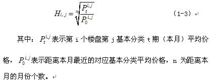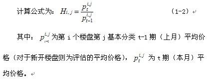對(duì)于該類樓盤,依據(jù)該樓盤本月之前三個(gè)月內(nèi)離本月最近的各分類成交數(shù)據(jù)計(jì)算各分類平均價(jià)格,再利用下列計(jì)算公式計(jì)算基本分類環(huán)比價(jià)格指數(shù):
