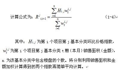 根據(jù)70個(gè)大中城市基本分類月環(huán)比價(jià)格指數(shù)分別利用各城市本月銷售面積和金額作為權(quán)數(shù)計(jì)算價(jià)格指數(shù),然后將兩個(gè)價(jià)格指數(shù)簡(jiǎn)單平均。