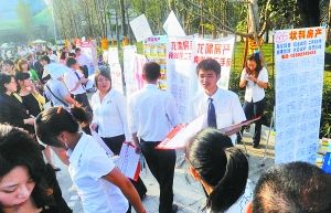 記者看到,不少置業(yè)顧問(wèn)為了在場(chǎng)外截留客戶,干脆在場(chǎng)外擺下戰(zhàn)場(chǎng)。他們有的將房源做成小的展板,舉在頭上,有的將房源寫(xiě)成大字報(bào)擺地上,在會(huì)展中心場(chǎng)外形成了一個(gè)場(chǎng)外房交會(huì)。