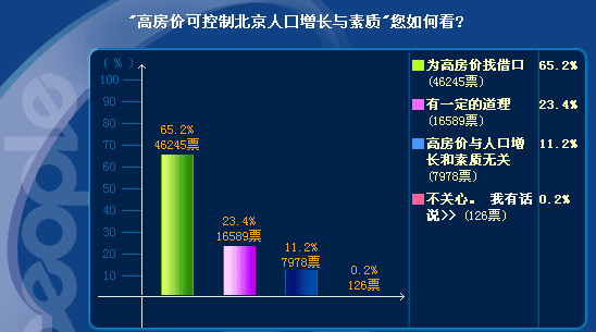 截止到14日晚21時(shí),參與調(diào)查的網(wǎng)民共計(jì)70938人,其中有46245人認(rèn)為這是在為高房?jī)r(jià)找借口,直接質(zhì)疑任志強(qiáng)的“素質(zhì)”,持此一觀(guān)點(diǎn)的網(wǎng)民占總?cè)藬?shù)的比例高達(dá)65.2%。此外另有11.2%的人也明確表示房?jī)r(jià)與人口增長(zhǎng)和素質(zhì)無(wú)關(guān)。不過(guò),也有近四分之一的網(wǎng)民認(rèn)為任志強(qiáng)的說(shuō)法"有一定道理"。