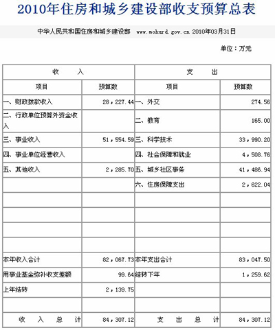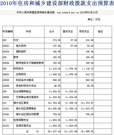 中新網(wǎng)3月31日電 住房和城鄉(xiāng)建設(shè)部網(wǎng)站今日發(fā)布住房和城鄉(xiāng)建設(shè)部部2010年部門預(yù)算表,其中包括2010年收支預(yù)算總表以及2010年財(cái)政撥款支出預(yù)算表。這是繼國土資源部及財(cái)政部公開部門預(yù)算后,第三個(gè)公開預(yù)算的中央部委。