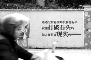 日前,讀者吳先生打進本報熱線稱,他在南岸一新建小區(qū)外看到了這樣一條標語,讓他很費解,他不知道開發(fā)商打出這條廣告宣傳語是什么意思?吳先生說,這句宣傳語這樣寫道:“難道全世界的雞蛋聯(lián)合起來,就能打破石頭嗎?做人還是要現(xiàn)實些。”