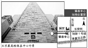 位于東三環(huán)國貿(mào)橋的西南角,矗立在長安街的南邊,主樓高達(dá)249.9米。中國指數(shù)研究院的調(diào)查表明,銀泰中心是目前北京在售總高度最高的樓盤。