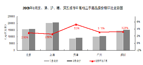 從圖表中的數(shù)據(jù)可以看出,2009年8月京、津、滬、穗、深五大城市的中高檔二手房?jī)r(jià)格均呈上漲走勢(shì)。在上述五大城市中,8月份中高檔二手房上海和北京分別上漲2.58%和2.93%。總體來(lái)看,2009年8月五大城市中高檔二手商品房在市場(chǎng)成交活躍的促進(jìn)作用下,價(jià)格再創(chuàng)新高。價(jià)格上漲最明顯的依然是天津,上漲了5.3%。其次是深圳和廣州,分別上漲3.25%和3.15%。