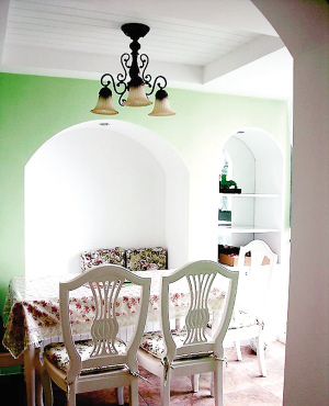 就餐環(huán)境的色彩配置對家人的就餐心理影響很大。孫女士在裝飾餐廳時,選擇淺綠色為主色調(diào),搭配上白色餐桌椅。明朗輕快的色調(diào)不但能增進(jìn)就餐者的興致,刺激食欲,而且能營造一種溫馨、甜蜜的氛圍(如圖②)。