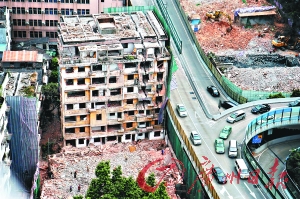 昨天下午,在東濠涌高架橋東側(cè)的圍蔽區(qū)內(nèi),錢(qián)路頭后街15號(hào)、18號(hào)兩棟樓早已完成拆遷,等待拆除。15號(hào)是一棟八層住宅樓,西側(cè)幾乎與高架橋“臉貼臉”。可就在距離高架橋幾米處,兩道幾十厘米寬的裂縫從樓頂直灌而下,裂縫中間只有數(shù)根鋼筋相連。從對(duì)面高樓往下望,筆直的裂縫直通地面,就好像用斧子劈開(kāi)的一樣。