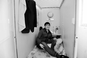 黃日新的膠囊公寓位于六郎莊一幢三層灰色民居的頂層。來到“膠囊公寓”門口,眼前一間10平方米左右的小屋里并排立著2個類似儲藏室、通體白色的隔間。每個隔間大約占地2平方米,高約2米、長2.4米、寬0.72米!斑@床就連姚明也可以睡,他可以從門這邊開始睡,就把腳伸到電腦桌里面去了!秉S日新說。記者看到,隔間外安著雙鎖防盜門,門內(nèi)無縫隙地鋪著張窄長的木板床,床下很空,可以放行李和雜物。床的盡頭有張電腦桌,墻上有盞圓形壁燈,壁燈下面有寬帶接口、有線電視接口和兩組電源插座!澳z囊”的上方由鐵網(wǎng)焊接而成,這不僅使得屋頂?shù)臒艄饪梢酝高^網(wǎng)子保證隔間內(nèi)的采光,還可以充分利用房子的暖氣、空調(diào)。拍拍“膠囊”的墻板,有些薄,隔音效果也不太好。黃日新解釋說,許多隔音材料的防火性能不好,可防火才是第一位的,于是,他舍棄了隔音。而考慮通風(fēng),所以也沒有封頂!暗珵榱吮Wo(hù)個人隱私,我在頂部安了兩根鋼筋桿,可以掛衣服,也可以掛‘頂簾’,拉上后就是個封閉空間!