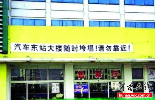 該工作人員表示,車站邀請專家對大樓進(jìn)行鑒定指出,此樓隨時會垮塌,有可能發(fā)生脆性斷裂,人員在里面非常危險,所有的辦公單位已經(jīng)搬出!按虺鰴M幅是為了提醒廣大市民‘此樓危險’。”