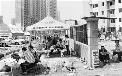 近日,在剛剛收房不久的常營兩限房富力陽光花園小區(qū)門口,數(shù)十家裝修公司聚集在路邊,搭起帳篷“門臉房”做生意。