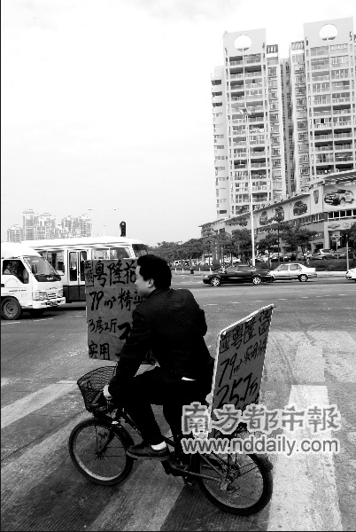 他不是收購(gòu)廢舊家電,而是推銷房子。昨天中午,在珠海香洲區(qū)梅花路三叉路口附近,出現(xiàn)了一個(gè)特別的房屋經(jīng)紀(jì)人:穿西裝,沒打領(lǐng)帶,騎一輛半舊女式自行車,車前后各固定一塊大紅紙板,寫著他認(rèn)為“最吸引”的二手房源信息。