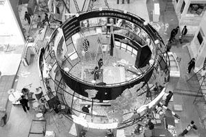 “嘿,哥們兒,慢點(diǎn)兒,碰壞了咱可賠不起!”今天上午,三個(gè)裝修工人抬著巨大的特裝板小心翼翼地往春季房展展廳里面運(yùn),領(lǐng)頭的小伙子一邊走一邊囑咐后面的兄弟。