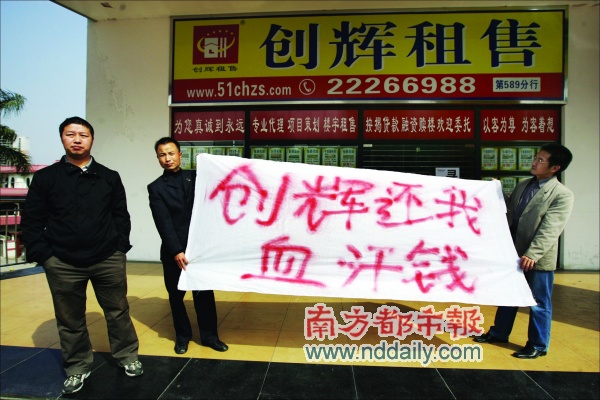 近20位客戶聞?dòng)嵹s到創(chuàng)輝租售水云軒中山總店追討欠款。店員的統(tǒng)一答復(fù)是“追討欠款的業(yè)主請到深圳總部查詢”。該公司一名陳姓置業(yè)顧問表示,“我們最多虧一個(gè)月的工資,還承受得了。最慘的是客戶,有的人怕是一輩子攢下的錢都難指望了。”