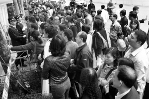 記者在銷售部看到,現(xiàn)場電子屏幕顯示,156套房子在不到兩個(gè)小時(shí)的時(shí)間已全部售光。但是仍然有很多的購樓者等在銷售大廳門外,希望能夠有一些購樓者放棄自己已購買的單位。