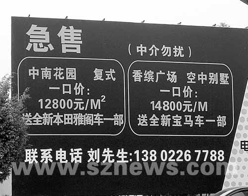 最大的一塊廣告牌矗立在白石路與科苑南路交匯處的西南側(cè),約10平方米大小,黑白分明的底色,端端正正的橙色粗體字格外引人注目!凹笔邸弊謽酉掠袃蓚橢圓形框,框內(nèi)寫明了具體出售內(nèi)容,一個是“中南花園,復式,一口價:12800元/平方米,送全新本田雅閣車一輛”,另一個是“香繽廣場,空中花園,一口價:14800元/平方米,送全新寶馬車一部”。廣告牌下端還留下了業(yè)主劉先生的手機號碼,并特別注明“中介勿擾”。