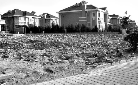 一片瓦礫、紅磚碎片,角落里并肩躺著4個抽水馬桶,旁邊堆著200多塊路牙石,曾經(jīng)小區(qū)里惟一聯(lián)排的別墅蕩然無存,與周圍紅墻藍(lán)瓦的整體風(fēng)貌格格不入。2月22日,記者獲準(zhǔn)在北京國際花園看到的這片廢墟,“造價”超過千萬。