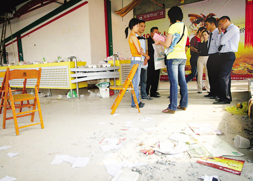 從當(dāng)日上午10時(shí)至下午2時(shí),不少業(yè)主聚集在售樓部內(nèi),要求開發(fā)商給個(gè)明確答復(fù),一直未能如愿。一些業(yè)主撕碎了文件,甚至把售樓部的椅子扔到門外。為此,轄區(qū)民警曾兩度趕到現(xiàn)場維持秩序。