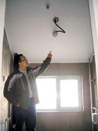 昨天,記者來到新怡家園6號樓10層李先生的新居。李先生說,這幢樓最高為11層,自己家的樓上是一間躍層,而自己家是平層,層高為2.8米?墒堑鹊津炇招路繒r,他們竟然發(fā)現(xiàn)位于北側(cè)的廚房和臥室的屋頂變成了斜斜的坡頂。記者看到,南側(cè)的房屋屋頂都為平的,只是到了廚房和北側(cè)的臥室屋頂突然變成坡頂。而本來就不大的廚房因為傾斜的坡頂顯得更加狹小,靠近窗子處的屋頂距地面的距離僅有1.7米左右,伸手即可觸摸到屋頂!八麄冞@樣做就是變更了設(shè)計!