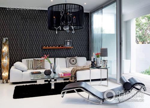 墻壁大面積使用黑底白紋的圖案,給地板留出足夠簡(jiǎn)潔的空間。沙發(fā)上方做出的原木架將發(fā)散的目光重新聚集,照片擺在一側(cè),圓扁的小蠟燭悄悄亮起,讓氣氛一下活躍起來。水晶吊燈線條優(yōu)美,外面籠罩了一層黑色豎紋裝飾,與沙發(fā)前純黑的地毯遙遙相望,而躺椅完美的弧度在提供給主人充足的休息之余,也配合著前兩者成為屋內(nèi)最為深暗的色彩之一。橫排的白色沙發(fā)顯露出十足的貴族氣息,高高豎在一側(cè)的地?zé)粢蚕鄳?yīng)地做出漂亮的大花圖案,亮燈時(shí)花朵若隱若現(xiàn),朦朧之美呼之欲出。