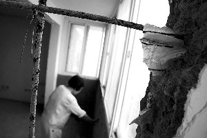 瑞旗家園兩業(yè)主裝修時,發(fā)現(xiàn)兩家陽臺之間的墻壁酥脆,碎墻塊用手一捏便成散沙狀(本報昨日報道)。昨日上午,昌平區(qū)建委兩名工作人員,與開發(fā)商工作人員到業(yè)主徐先生家中鑒定酥脆墻壁,建委人員對著陽臺墻壁踢了幾下,墻上的土便“嘩嘩”往下掉,該人員邊踢邊說,“這樣不行,不過關(guān)!绷硪唤ㄎぷ魅藛T搖了搖露出的鋼筋,發(fā)現(xiàn)鋼筋與主體墻壁和天花板都沒勾連上,證實存在質(zhì)量問題。