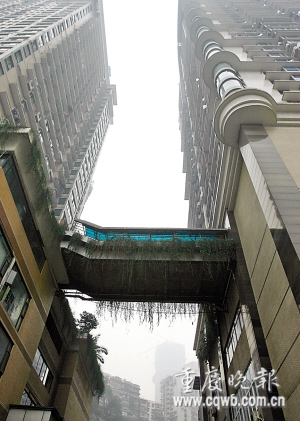嘉園有業(yè)主500余戶,錦園有業(yè)主600余戶。當初,開發(fā)商特意在兩樓之間設計了一座天橋,目的是讓兩個小區(qū)的空中花園、健身器材等可以共享,更重要的是方便兩個小區(qū)業(yè)主出入——錦園的業(yè)主可以經嘉園直達臨江門、解放碑,嘉園業(yè)主也可經錦園到一號橋。