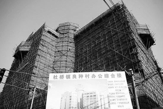 說它是熱帖,準(zhǔn)確地說其實就是一組照片。照片中,一幢大樓拔地而起,主體框架已搭建完畢,不過由于尚未完工,整幢大樓像是穿上了一層漁網(wǎng)服。大樓底下立著一塊規(guī)劃牌,最上面寫著“杜橋鎮(zhèn)良種村辦公綜合樓”,中間是大樓的效果圖,9層高的大樓看上去頗為壯觀。