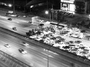 事發(fā)惠新東橋與望和橋之間的北四環(huán)外環(huán)主路!八沫h(huán)上全是車,生生被一座人墻給截住了。”前晚10時許,芍藥居北里的雷先生在自家陽臺看到了這樣的場景。他介紹,當時有數(shù)十人站在北四環(huán)53號小營路出口旁,將東向西主路的五條車道幾乎全部堵死。五分鐘內,上百輛經過此地的轎車、機場巴士和商務客車被攔截在他們面前,喇叭聲和叫嚷聲不時響起。幾名司機下車理論后,人群讓出了最內側一條車道,車流緩慢通行。