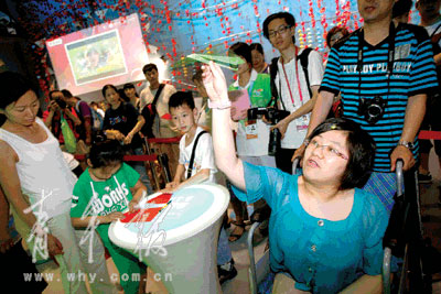 昨天上午,在世博局相關(guān)工作人員的安排下,不需要排隊(duì),通過(guò)媒體工作人員專用通道,小邢怡第一時(shí)間入了園。8點(diǎn)50分,邢怡來(lái)到了向往已久的中國(guó)館門(mén)前,早已等候著的中國(guó)館副館長(zhǎng)龔惠斌迎了上來(lái),熱烈歡迎小邢怡來(lái)中國(guó)館,龔惠斌副館長(zhǎng)還送了小邢怡一份小禮物,精致的世博徽章,還有介紹中國(guó)館的精美圖冊(cè)。小邢怡傻傻地笑著說(shuō)不出話,咧著嘴開(kāi)始了奇妙的中國(guó)館之旅。后來(lái)小邢怡悄悄告訴記者,一直看新聞上說(shuō)中國(guó)館預(yù)約券有多么的難得,參觀中國(guó)館有多么的不容易,她根本沒(méi)想到自己能那么幸運(yùn),所以剛進(jìn)中國(guó)館的那會(huì)兒,感覺(jué)像做夢(mèng)一樣。