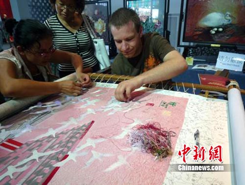 中新網(wǎng)上海7月20日電(肖前輝 劉吉科)入駐上海世博園寶鋼大舞臺“中國元素活動區(qū)”傳習(xí)區(qū)表演半個月以來,湘繡以其神奇的針法和快樂的參與性受到世博游客的熱捧。截至7月20日,已有來自世界各地的上千名觀眾參與了刺繡。