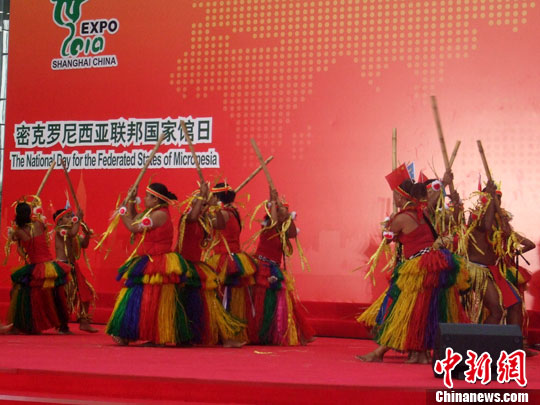 中新社上海8月29日電 (記者 鄭瑩瑩)以熱帶風(fēng)情著稱的太平洋島國(guó)密克羅尼西亞29日迎來(lái)國(guó)家館日。在官方儀式上,數(shù)十名島國(guó)舞者穿著及踝草裙,手持竹竿相互敲打,以原生態(tài)歌舞展現(xiàn)島國(guó)熱情奔放的民俗風(fēng)情。
