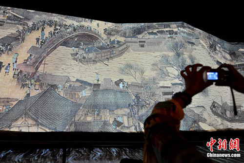 在中國館“智慧長河”展區(qū),首先映入觀眾眼簾的,是投影到100多米長卷上的北宋畫家張擇端的《清明上河圖》所描繪的北宋汴梁城的場景。穿過該投影長廊,觀眾能近距離欣賞到另一個(gè)版本的《清明上河圖》——遼寧博物館藏的明代仇英版《清明上河圖》,該圖畫中人物超2000個(gè),所描繪的明代蘇州市井生活的繁華程度遠(yuǎn)遠(yuǎn)超過宋代。