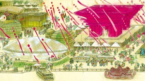 在中國館省區(qū)市館入口處,這幅長21米、寬0.47米的繪畫作品吸引了每一個經(jīng)過的人。畫卷描繪了浦江兩岸世博園區(qū)內(nèi)所有的場館以及近7000個游人,畫面上南浦、盧浦大橋橫跨兩岸,路上車輛、江面游輪、空中飛艇往來繁忙,園區(qū)內(nèi)形形色色的建筑中間人流熙熙攘攘,一派熱鬧繁華的景象。有意思的是,長卷不僅展現(xiàn)了世博園區(qū)恢宏的場景,還刻畫了許多生動的細節(jié),如畫中有兩個孩子在沖向他們喜歡的場館途中,男孩的帽子被風吹走了;一對情侶在深情擁吻;“小白菜”勸說躺在長椅上睡覺的參觀者等。