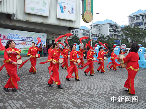 在長(zhǎng)青路、成山路口的華聯(lián)吉買盛廣場(chǎng)四周,23個(gè)2米高1米寬笑容可掬的海寶圍著一圈,不斷地向前來(lái)參加活動(dòng)的志愿者招手致意。一旁,喜慶的龍車上,鑼鼓敲得震天響。廣場(chǎng)中央,來(lái)自居民區(qū)的志愿者代表和來(lái)自社區(qū)學(xué)校的紅領(lǐng)巾代表集結(jié)在一起,他們將迎接海寶到小區(qū)。