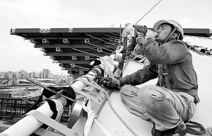 下午兩點(diǎn),記者帶著溫度計(jì)來(lái)到世博工地外國(guó)館片區(qū),陽(yáng)光下,水銀柱停留在40攝氏度上。走上5分鐘,汗水濕透了全身。高溫挑戰(zhàn)著每個(gè)建設(shè)者的意志力。在法國(guó)館將要完成的鋼結(jié)構(gòu)屋頂上,幾個(gè)工人正在安裝最后的鋼架,為了避免曬傷,他們穿著長(zhǎng)袖長(zhǎng)褲的工作服,戴著安全帽。從屋頂爬下來(lái)時(shí),每個(gè)人都像是剛從水里撈上來(lái)的。工人老張說(shuō),安全帽不能脫,汗水一刻不停地沿著帽子流下來(lái),眼睛都睜不開,得一直用手擦。
