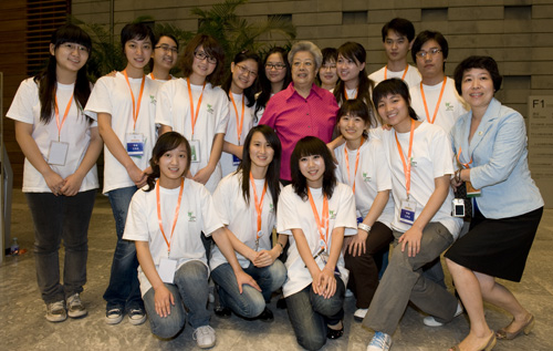 參觀結(jié)束時,來自京滬兩地的“走進(jìn)世博會”展覽青年志愿者們自發(fā)等候在展廳出口處向“吳奶奶”問好。吳儀鼓勵大家要當(dāng)好世博會志愿者,并與他們合影留念。