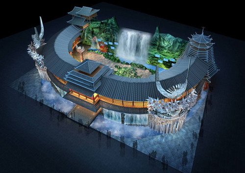 貴州館平均高度為7.2米,極端高度達(dá)8.5米,展示主題為“醉•美貴州,避暑天堂”。在600平方米的展示面積中,將貴州的自然山水和多元民俗文化巧妙結(jié)合,抽取風(fēng)雨橋、鼓樓、苗寨、銀飾和山水瀑布極具貴州特色的視覺元素,高度凝煉貴州人文自然風(fēng)貌以及“醉•美”和“避暑”的特色。強(qiáng)烈的視覺沖擊力和民俗特色,力求使絕大多數(shù)不了解貴州或從未踏足過(guò)貴州的參觀者,也能在第一時(shí)間內(nèi)對(duì)貴州館留下深刻的印象。