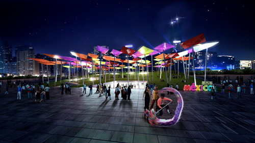 風箏廣場是墨西哥館的核心。風箏在nahuatl語(民族方言)的名稱是“papalotl”,也就是西班牙語中的蝴蝶。風箏是連接墨西哥文化和中國文化的一個要素。參觀者可以在墨西哥館里購買風箏,或者親手做一個風箏,然后在風箏廣場上放飛。由風箏組成的森林代表著墨西哥人對未來的期待,廣場上的人造綠草表達了墨西哥人對城市綠地的關注。人們可以在綠地上進行各種活動,諸如讀書、野餐或是在陰涼處隨意地休憩;綠地上空,風箏在飛翔。
