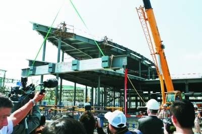一邊籌資一邊建館的美國館,直到今年7月份才遲遲開工,雖然在參展資金上有些捉襟見肘,但其6000平方米的占地面積仍然是所有外國自建館中最大的之一。讓人吃驚的是,美國館僅用了兩個多月的時間,就完成了總體結(jié)構(gòu)封頂(見上圖),可謂是后來居上。在建設(shè)工期上取得如此效率,和上海方面的積極配合協(xié)作是分不開的。14日下午,新任美國駐華大使親臨世博園,參加了美國館的封頂儀式。