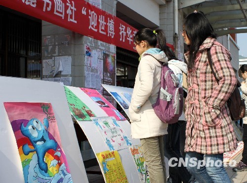 12月22日,安徽師范大學(xué)學(xué)生正在觀(guān)看“迎世博”書(shū)畫(huà)作品。當(dāng)日,安徽師范大學(xué)赭麓書(shū)畫(huà)社舉辦“迎世博 抒華章”書(shū)畫(huà)作品展覽活動(dòng),展出了86件由大學(xué)生自己創(chuàng)作的迎世博書(shū)法、繪畫(huà)作品,吸引了不少大學(xué)生的目光。隨著2010年上海世博會(huì)日益臨近,安徽師大學(xué)生舉辦了一系列活動(dòng)來(lái)表達(dá)對(duì)世博會(huì)的期盼和祝福。中新社發(fā) 劉淮宇 攝