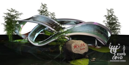 湖南館取名為“桃花源里·Xanadu”——Xanadu英文意為“世外桃源”,是西方世界描述神秘仙境時(shí)最廣泛使用的詞。湖南館的展示主題是“都市桃花源”。展館外觀之所以采用雙“魔比思環(huán)”相扣的造型,是取義無窮大符號“∞”和中國太極,這與和諧自然的中國理想城市意境以及長株潭城市群“兩型社會”的理念相契合!澳П人辑h(huán)”是雙環(huán)環(huán)繞,就單環(huán)而言展開長度達(dá)100米,高3米,只有一個(gè)面和一個(gè)邊界。由于主體造型是不規(guī)則的建筑環(huán)體,對施工和投影都帶來了重大挑戰(zhàn)。