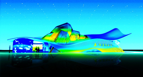 記者在現(xiàn)場看到,盡管尚需細化,但剛剛誕生的山東館已顯示出不凡魅力。展館占地600平方米,最高處約9米,以藍色為主色調(diào),突破了以往展館四墻合圍的方正常規(guī),外觀將大海的浪涌和雄峙的泰山融為一體,流暢的曲線勾勒出山東“海岱交融”的地理形勝,表達出“青山連綿不絕,綠水長流不斷”的文化意境。