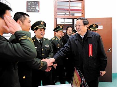 俞正聲和丁薛祥、陳豪、胡延照、王新奎、張學(xué)兵等來到武警上海市總隊世博安保任務(wù)部隊某部,實地察看值班室,聽取園區(qū)安保情況介紹;走進部隊營房,與武警戰(zhàn)士親切交談,了解戰(zhàn)士們的訓(xùn)練、生活情況。聽到戰(zhàn)士們對生活保障表示滿意,俞正聲十分高興,他說:“春節(jié)即將來臨,請向你們的家人問好。今年迎辦世博的任務(wù)很繁重,相信通過大家的共同努力,我們一定能實現(xiàn)平安世博的目標!睉(zhàn)士們鏗鏘作答:“為世博爭光彩,為祖國作奉獻,永遠做黨和人民的忠誠衛(wèi)士!